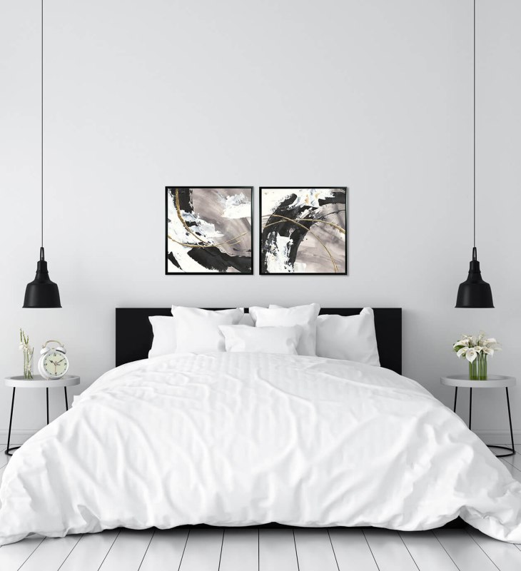 Bold arcs of deep black sweep across a crisp white background, punctuated by gleaming gold leaf accents that catch and reflect light. Printed on premium canvas and sealed with an overvarnished finish for depth and durability, the artwork is stretched within a minimalist black wooden frame. Ideal as a standalone statement or paired in multiples, Gilded Arcs I brings contemporary sophistication and a touch of metallic glamour to living rooms, bedrooms, offices, or gallery walls. Arrives ready to hang for immediate impact.