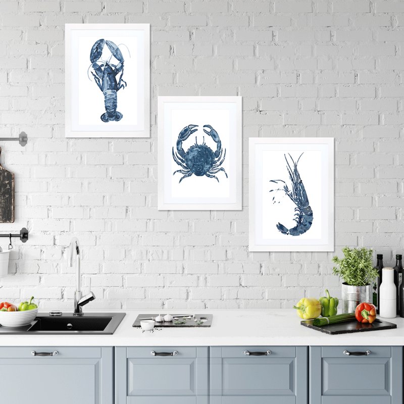 Indigo Shellfish I is a 66.5 cm × 52 cm portrait-format coastal print, finished behind clear glass in a white brushed-wood frame with a crisp white mount.