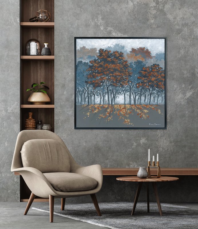 Light on the Leaves by Diane Demirci is a 102 cm × 102 cm square landscape-format canvas print, exclusive to us, hand-embellished with bronze metal leaf and presented in a sleek black L-shape frame.
