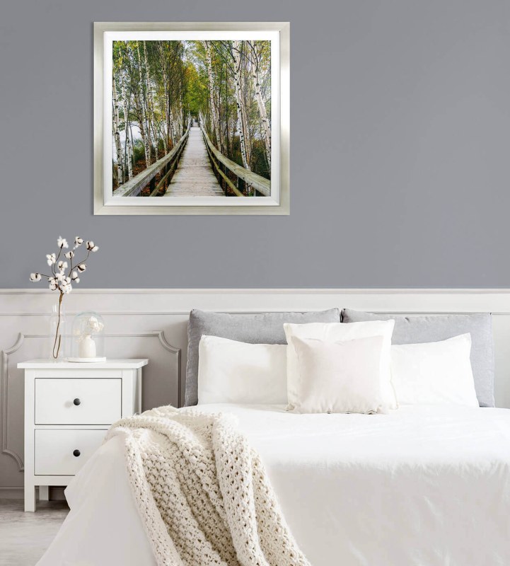Kas Stone’s The Path Home invites you into a tranquil woodland scene, where a gentle walkway meanders through silver birch trees bathed in soft light. The print is sealed with a protective over-varnish that highlights the earthy brown, green, and white palette, then matted with a crisp white slip to enhance its visual focus. Encased in a minimalist silver frame, this piece brings both serene natural beauty and contemporary refinement to living rooms, bedrooms, or entryways. Ready to hang, it creates a peaceful focal point that complements a variety of interiors.
